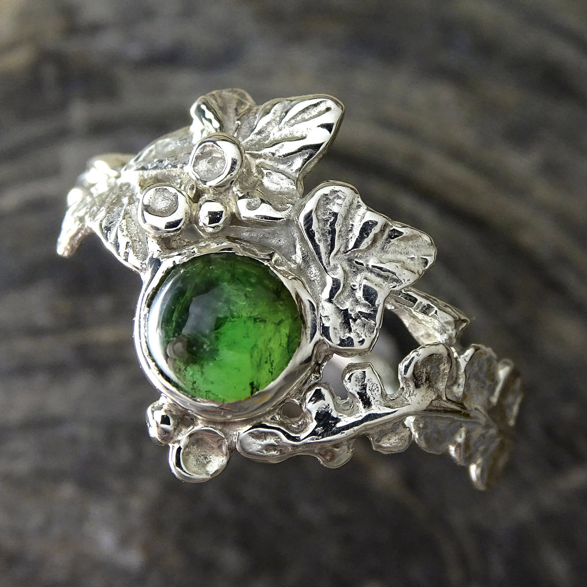 Hand engraved Ivy Leaves, with Lichen, and a delicate Polypody fern, entwine around a 5.5mm forest Green Tourmaline cabochon, and upon a wood grain textured twig ring.