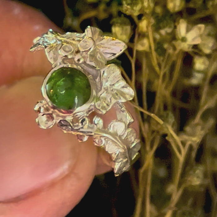 Inform when this item available Entwining Fern and Ivy leaves ring, 5,5mm Green Tourmaline cabochon, 9ct white gold