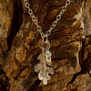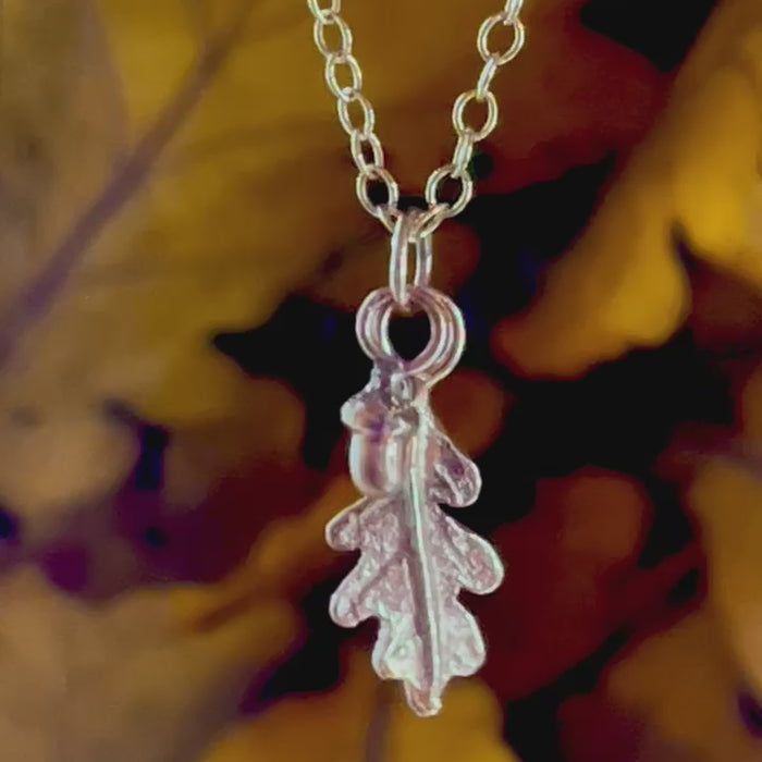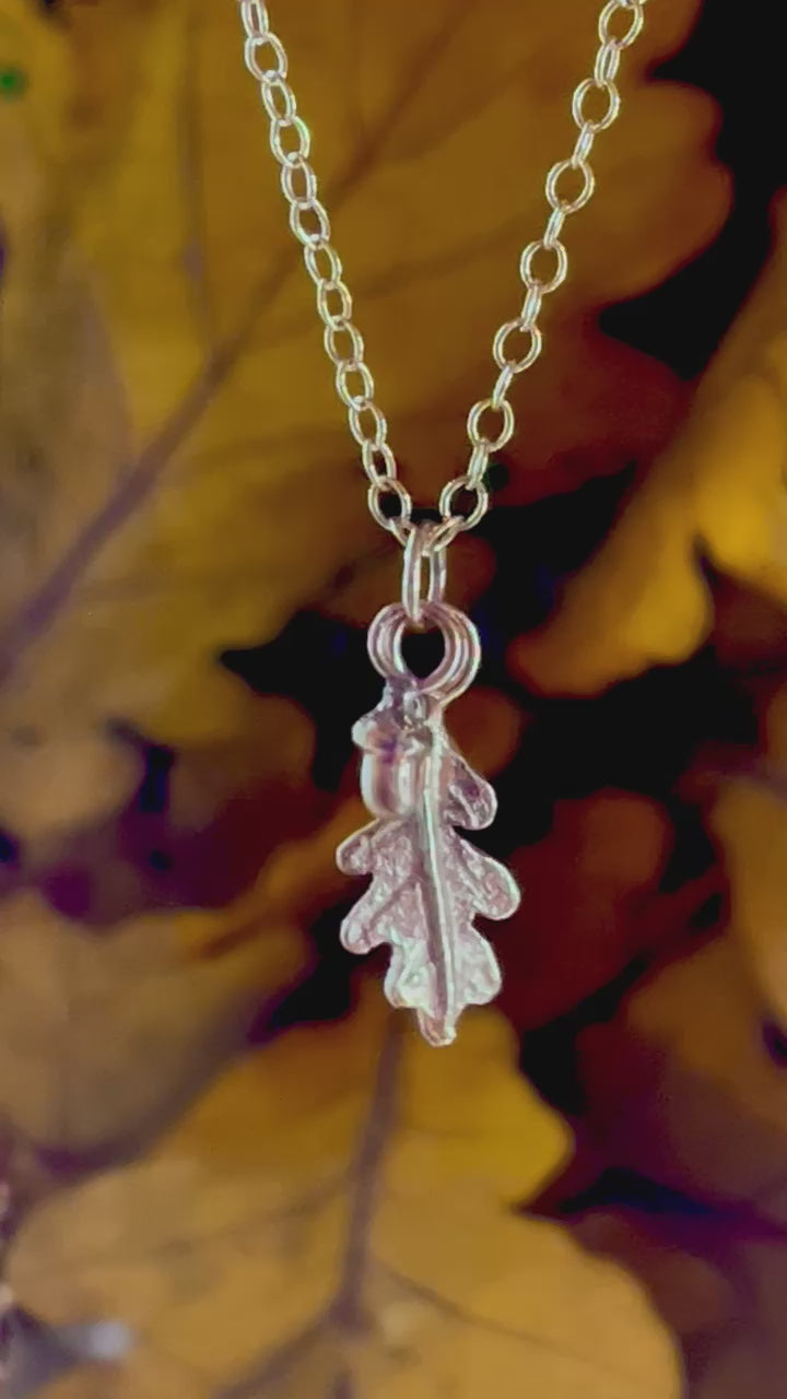 Oak leaf and Acorn pendant. Hand made with engraved veins and an organic texture created through a heat process called reticulation. Suspended on a fine linked trace chain
