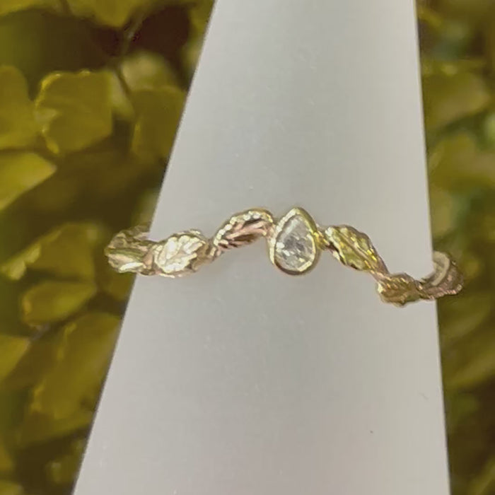 Two pairs of delicate hand engraved leaves with tendrils, curl around the twig ring, and meet in a gentle curve, holding between them a 3mm x 2mm Diamond, H si. grade. Fits snugly beside a small Solitaire ring